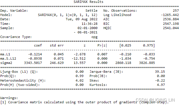 Having obtained the optimal model parameters, inspect the model properties using the summary() method on the fitted results to view detailed statistical information: