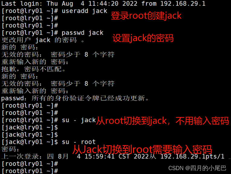 注意:从权限低的用户切换到权限高的用户需要输入密码,从权限高的用户到低的不用