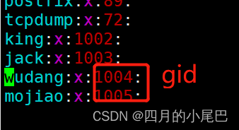每行的含义:组名:口令:组标识号(gid):组内用户列表(隐藏)