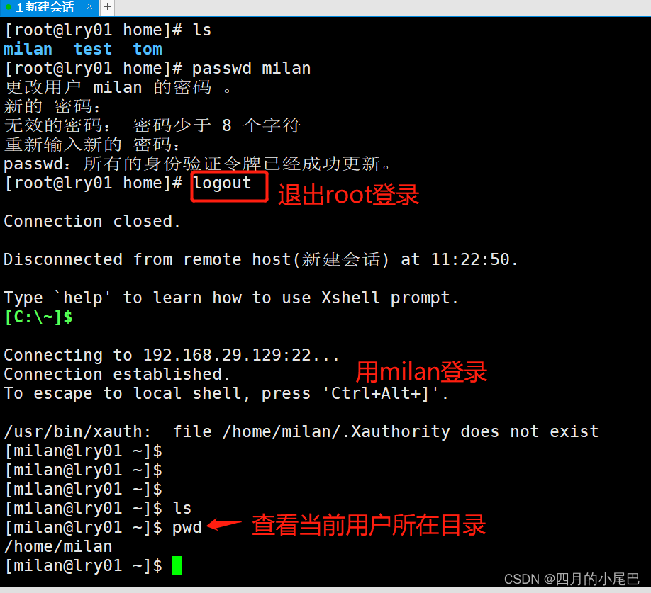 步骤:Xshell中连接Linux>以root身份登录>切换到/home目录下查看当前用户>输入useradd milan 回车>输入ls查看/home目录下是否新增用户米兰成功