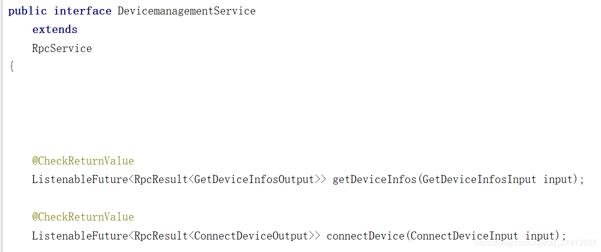 The column above defines a connection device RPC call , This yang The model will be generated after compilation binding Interface , It can be provided for us to realize .
