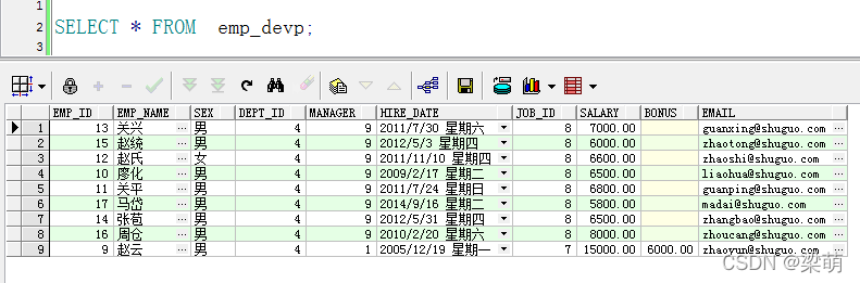 The first time you run the above statement ,emp_devp There is no data in the table , Therefore, for each record in the data source WHEN NOT MATCHED THEN Branch , That is, insert data .