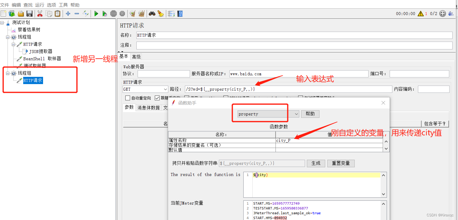 线程组1——(赋值:setProperty函数)——Jmeter属性——(读取:property函数)——使用前面的返回值