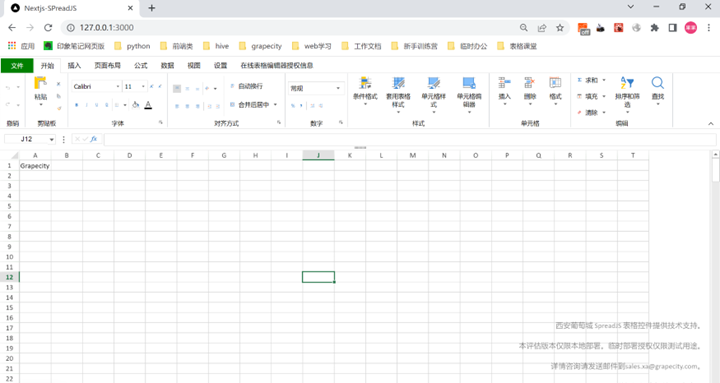 const OnlineSpread = dynamic(() => import('../components/OnlineSpread.js'),{ ssr: false})引入完成之后,我们就可以在当前页面中使用了,精简index.js中的代码,最终代码如下:import Head from 'next/head'import Image from 'next/image'import dynamic from 'next/dynamic'const OnlineSpread = dynamic(() => import('../components/OnlineSpread.js'),{ ssr: false})const OnlineDesigner = dynamic(() => import('../components/OnlineDesigner.js'),{ ssr: false})export default function Home() { return ( <div> <Head> <title>Nextjs-SPreadJS</title> <meta name="description" content="Generated by create next app" /> </Head> <OnlineSpread/> </div> )}执行npm run dev,显示效果如下: