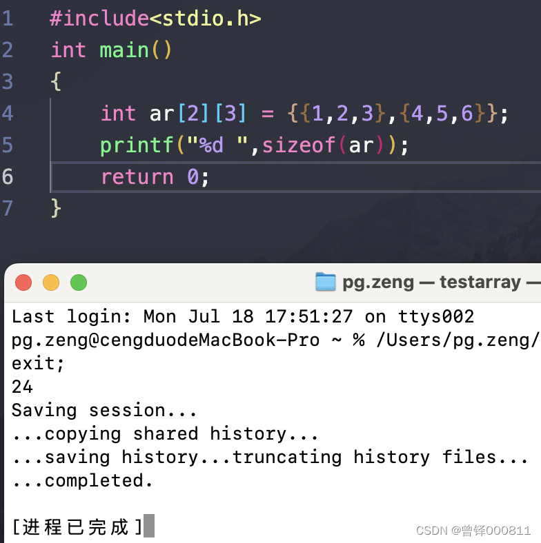 可以看到,两个地址相差12,用12 / 4 = 3,单位是元素,所以给数组加1直接就是加一行,因为一行里面有三个元素,所以求二维数组的行就变的十分直观了,例如二维数组ar,数组的总大小除以三个元素的大小(12)也就是行数,我们可以认为,一行也就是一种元素类型,所以ar数组就有两种元素类型,分别是它每一行的首元素地址,故二维数组行可以用数组的总大小除以元素类型,如图:
