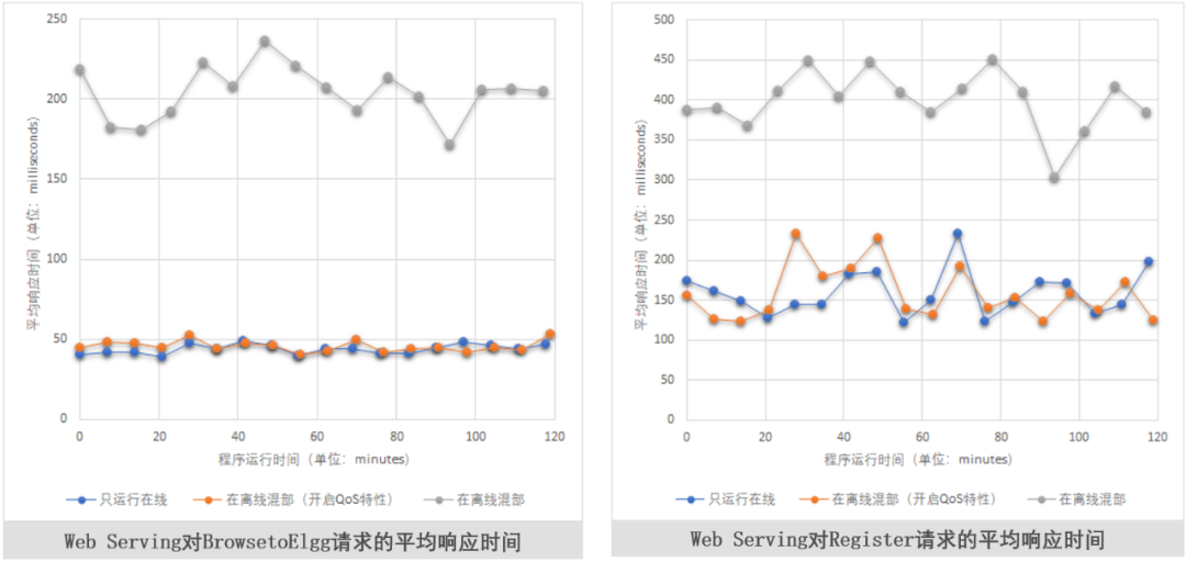 从上面的曲线数据图可见,在 2 小时的测试周期里, 没有开启混部 QoS 特性的测试 2,在线业务受到了明显的干扰,Web Serving 对 BrowsetoElgg 以及 Register 请求的平均响应时间均延长到了 3 倍左右,可见在线业务在受到离线业务干扰后性能下降了 3 倍;而开启了混部 QoS 特性的测试 3,在线业务的性能基本能够与仅运行在线业务的测试 1 持平。
