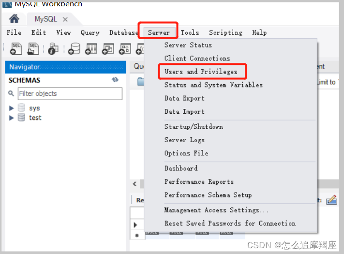 1、 open MySQL Workbench, choice Server->Users and Privilegs