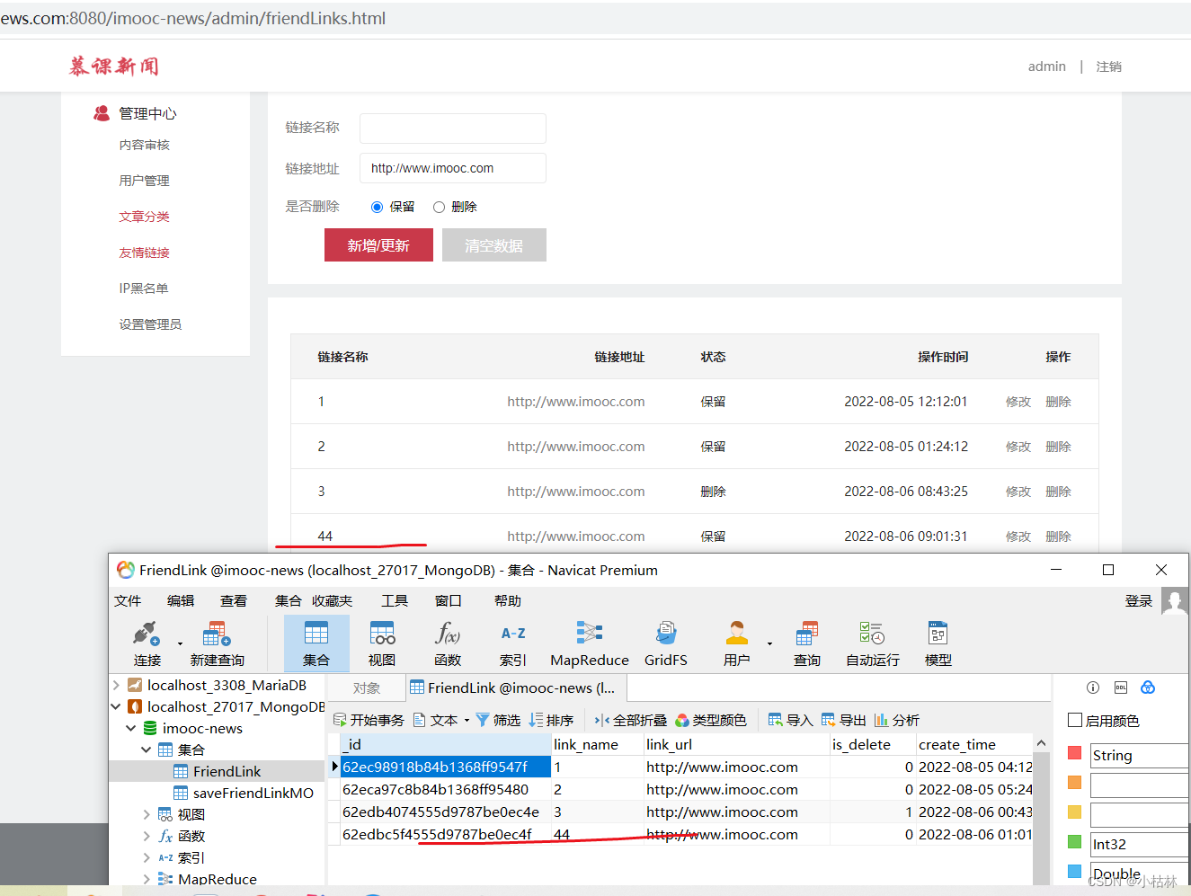 当前位置:网站首页>63:第五章:开发admin管理服务:16:开发【删除友情链接,接口】;(核心是:理解MongoDB,删除数据的逻辑)