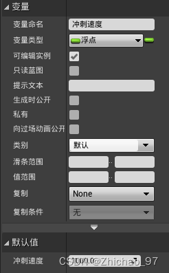 4.打开第一人称角色蓝图,新建一个浮点型变量 命名为冲刺速度 ,设置为可编辑示例,默认值为1000
