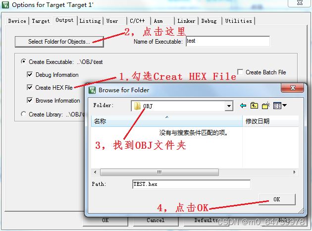 (Options for Target 按钮),弹出 Options for Target ‘Target 1’对话框,选择 Output 选项卡 → 选中 Create Hex File (用于生成 Hex 文件)→ 点击Select Folder for Objects → 找到 OBJ 文件夹 → 点击 OK ,如图 1.8 所示