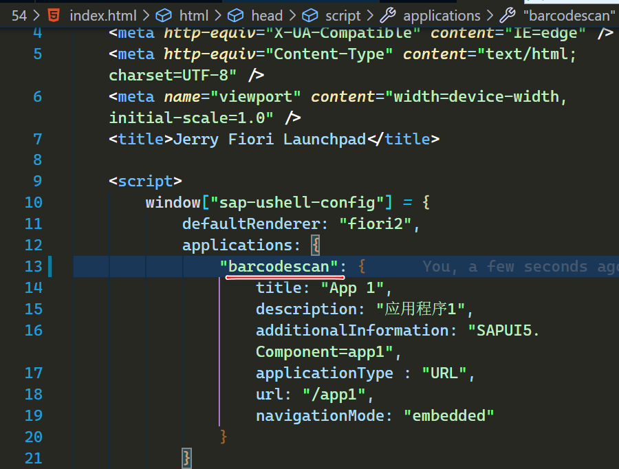 url 里的片段 barcode-scan,来自 index.html 里 applications fields under the area,如下图第 13 行所示: