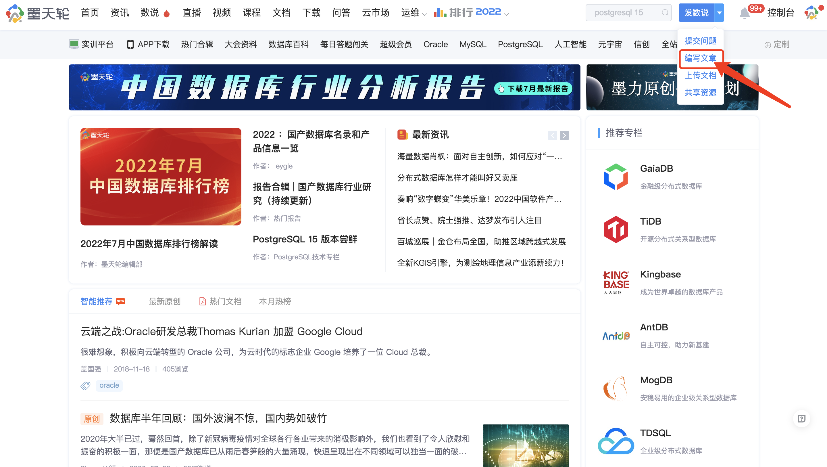 第一步:进入墨天轮首页,编辑文章