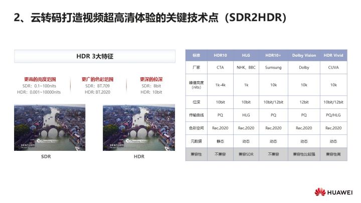 Another key technical point , Let's take a look at a technology that has developed rapidly in recent years ,SDR 2HDR .HDR Because of its comparison SDR With a higher brightness range 、 Wider color range and deeper depth are well known , Correspondingly, the video has richer details , Wider color gamut and more natural color transition . We can see in the picture above SDR and HDR Comparison of , In brightness 、 Color saturation and contrast , Can clearly feel HDR The visual effect of the picture is better . in addition , At present HDR Different standards have also emerged in the field , From the chart, we can see the differences of these standards in different dimensions .