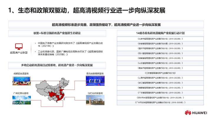 Driven by both ecology and Policy , At present, many places have launched UHD project experimental bases , Such as the Ultra HD base in Chengdu 、 Qingdao HD video base 、 Guangzhou Huaguoshan base and malanshan content base , The UHD industry has further developed in depth .