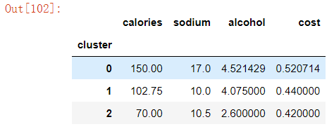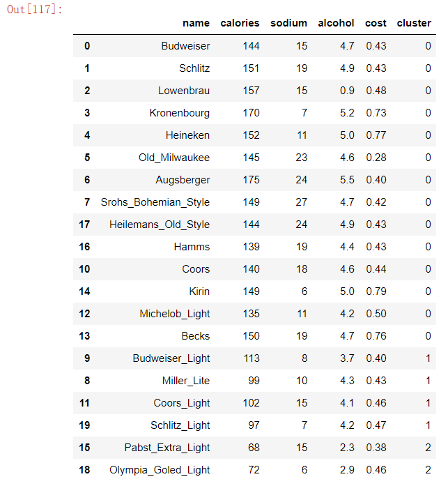 在表beer中添加一列clusterPut in the label data,km.labels_每个样本点对应的标签,并进行升序排序