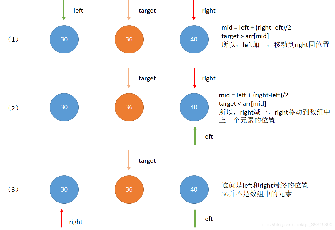 首先,我们要明确在数组中如果没有找到target的时候,left和right的最终的索引位置是怎样的。