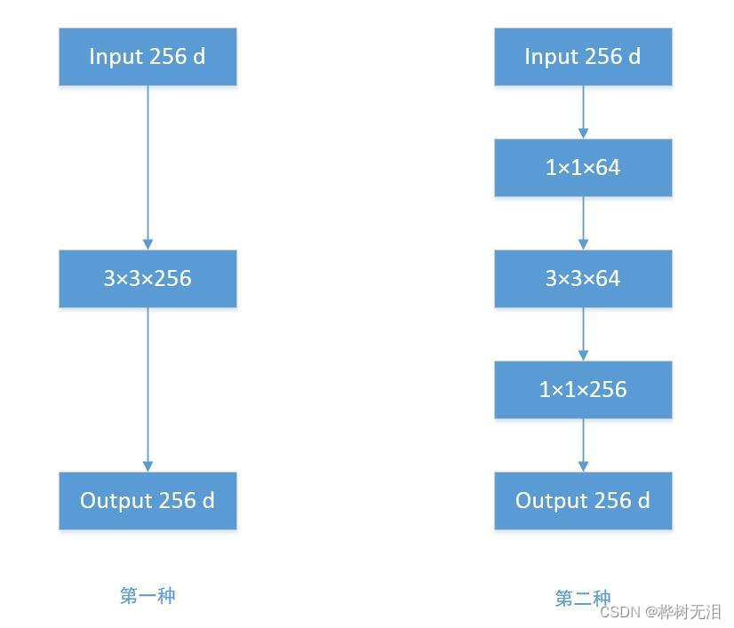 - 先经过 1x1 的卷积核,再经过 3x3 卷积核,最后经过一个 1x1 卷积核参数量:256×1×1×64 + 64×3×3×64 + 64×1×1×256 = 69632
