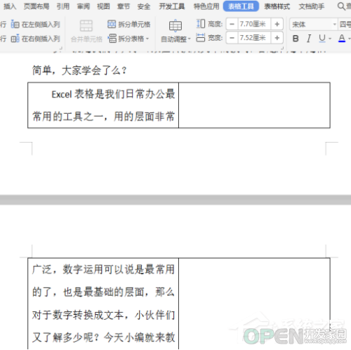 1、首先我们打开一个带有表格的文档,且表格居于两个页面之间,如下图所示: