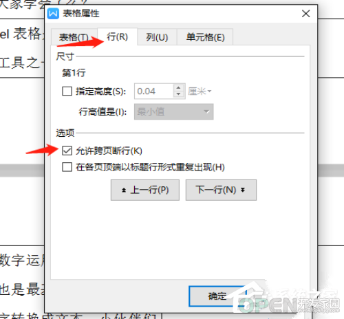 4、会弹出以下界面,我们选择行列,然后把允许跨页断行之前的对勾去掉,最后点击确定,操作见下图: