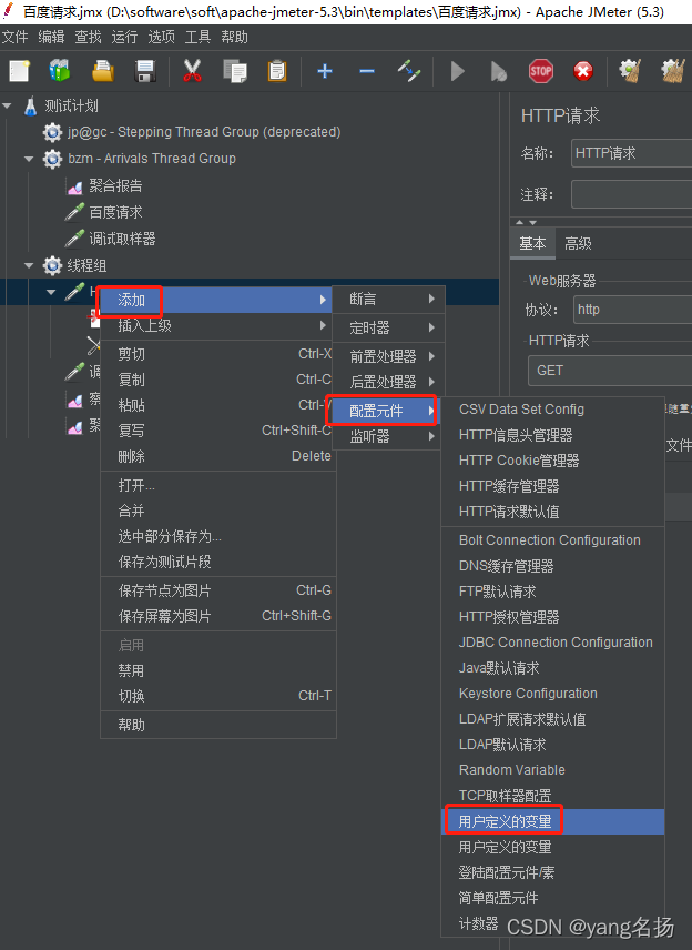 b) 选中线程组,右键选择 配置元件( config element)-->User Defined Variables。