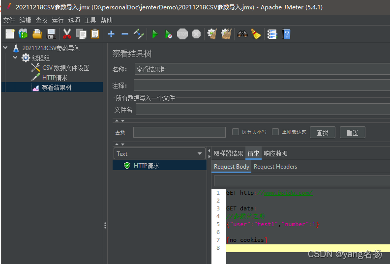 3.在结果树上查看请求体。这里要注意一下,多个请求的时候,需要在线程组那里设置多次请求。