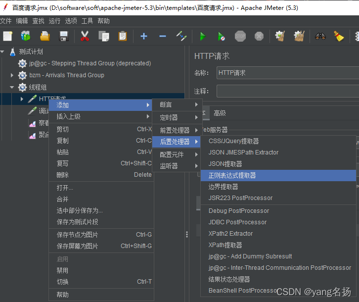 在HTTP请求中,右键-->添加-->后置处理器-->选择需要的关联方式(如下图有很多种方法可以提取动态变化数据)