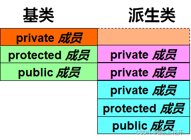 基类的公有成员和保护成员在派生类中成了保护成员,私有成员仍为基类私有。