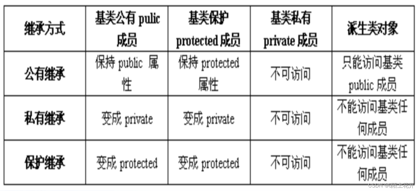 1.无论采用何种继承方式得到的派生类,在派生类中不能访问基类的私有成员,私有成员只能被本类的成员函数访问。