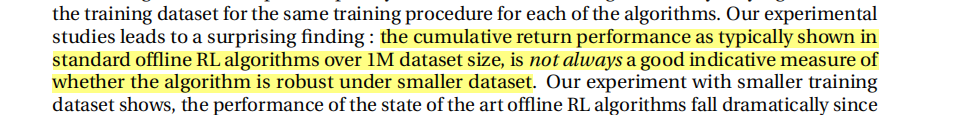 结论: 在标准离线 RL 算法中通常显示的超过 1M 数据集大小的累积回报性能并不总是衡量算法在较小数据集下是否稳健的良好指示性指标。