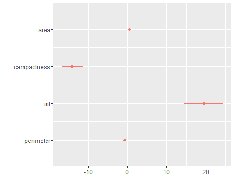 From the results , You can see the confidence interval of each variable parameter ,campatness and int The confidence interval of is larger , The confidence intervals for the other two variables are small .