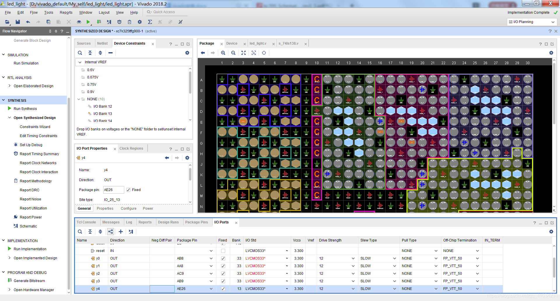 - 完成后点击左边 open synhtesized Design 然后右上角Default Layout改为I/O Planing