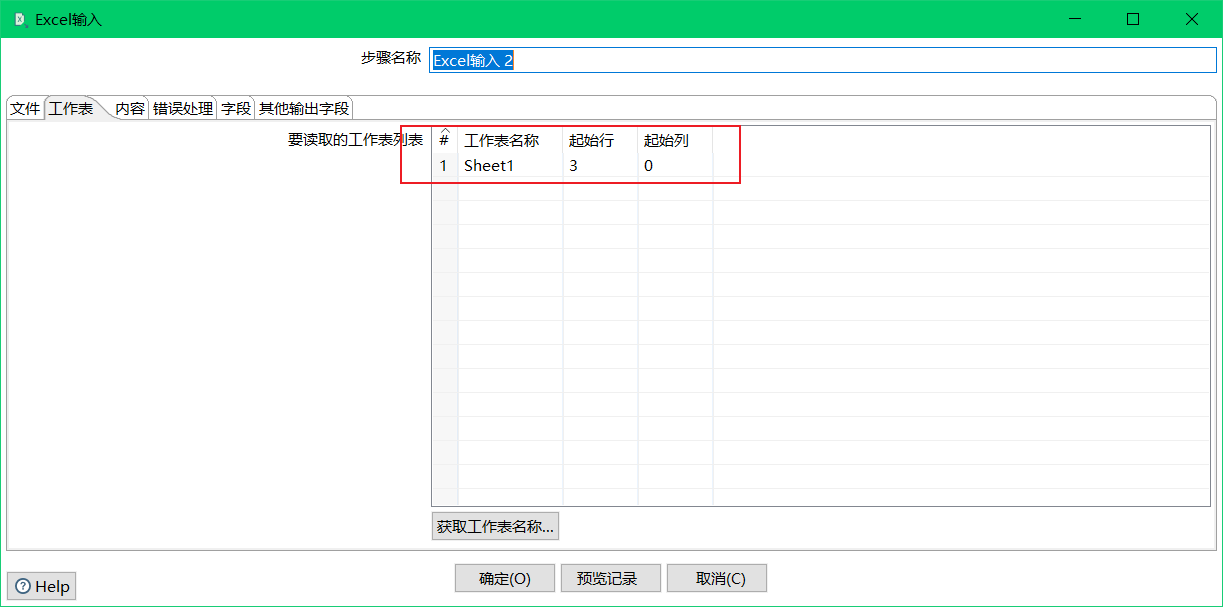 Execl2输入组件需要注意的点是sheet数据读取的起始位置: