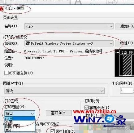 4、弹出"打印"对话框。点击"打印区域→打印范围"文本框向下箭头,选择"窗口"项。