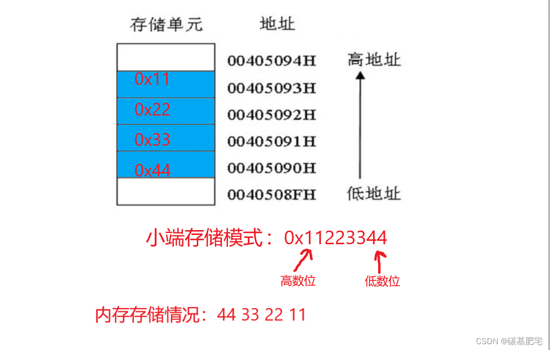 例如,要存储一个十六进制数 0x11223344。该数中右端是低数位,左端是高数位(类比十进制数,十进制数10里面0是个位更低,1是十位更高)。