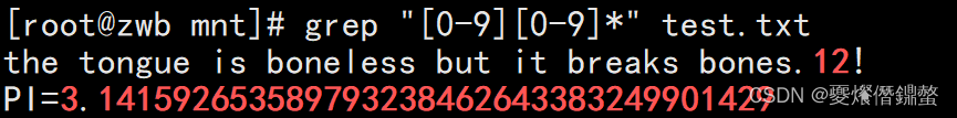 [[email protected] mnt]# grep "[0-9][0-9]*" test.txt