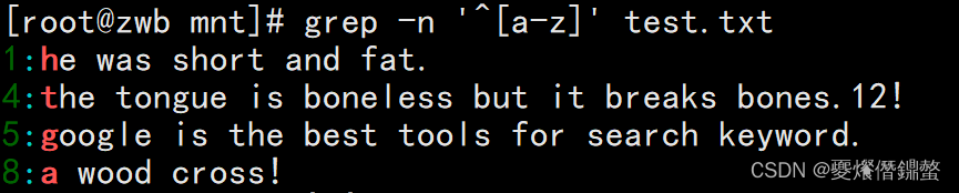 [[email protected] mnt]# grep -n '^[a-z]' test.txt