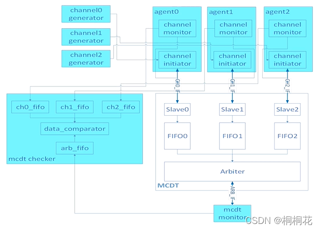 对于MCDT 验证结构,我们需要3个channel monitor来监测对应的channel接口,以及1个arbiter monitor来监测arbiter接口。