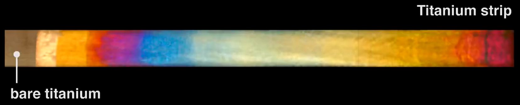 利用电化学,让钛氧化,随着氧化层的逐渐加厚,其颜色也在随之变化: