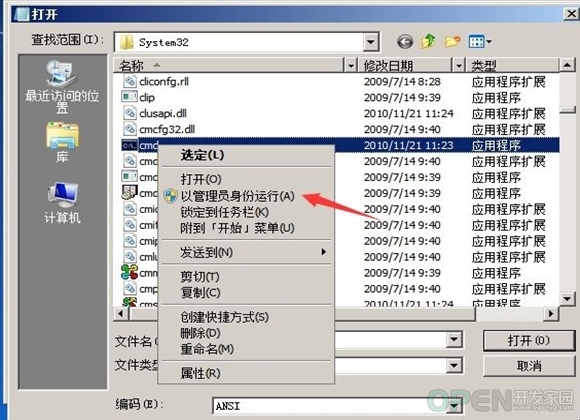 8、查找【c盘-windows-System32】目录位置的【cmd】程序,右键点击【cmd】,选择【以管理员身份运行】;