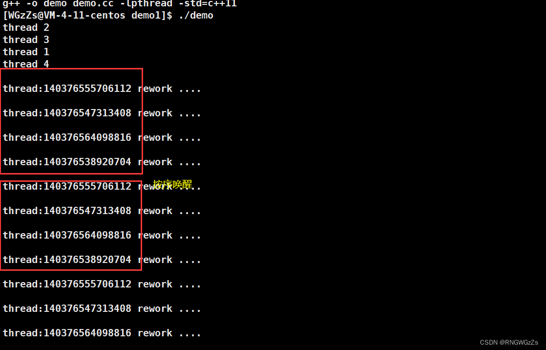 int pthread_cond_signal(pthread_cond_t *cond); //唤醒单个 出在序列前列的进程