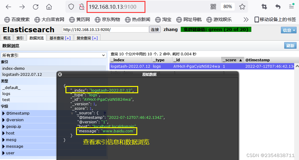 浏览器访问 http://192.168.10.13:9100 查看索引是否创建
