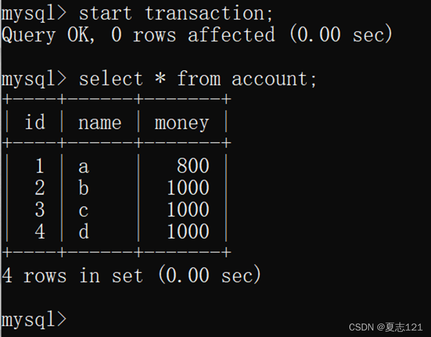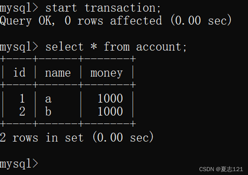 a The account was successfully given to b Account transfer 100 Yuan , here a Account cannot be given to b Account transfer , Because the transaction has not yet been committed , You can roll back the transaction , The following is the result of the query after rollback :