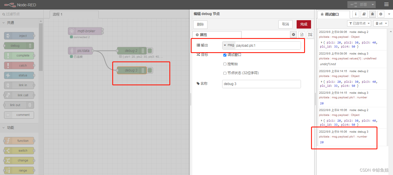 (4)配置debug2输出显示json里的plc1内容为 msg.payload.plc1