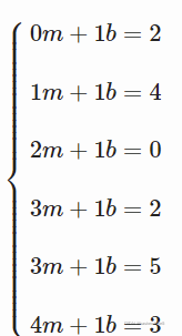 我们有一组方程 mx+b=y。 这些用于返回截距参数。 例如,在对应于第一个点的第一个方程中,我们有很好的 x=0 和 y=2。 这可能会令人迷惑,因为这里的向量 x 对应于系数。 这是因为我们正在寻找直线的系数而不是 x 和 y 未知数。