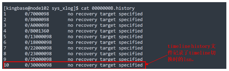 -rw------- 1 kingbase kingbase 426 Aug 3 10:30 0000000B.history切换完成后timeline发生切换: