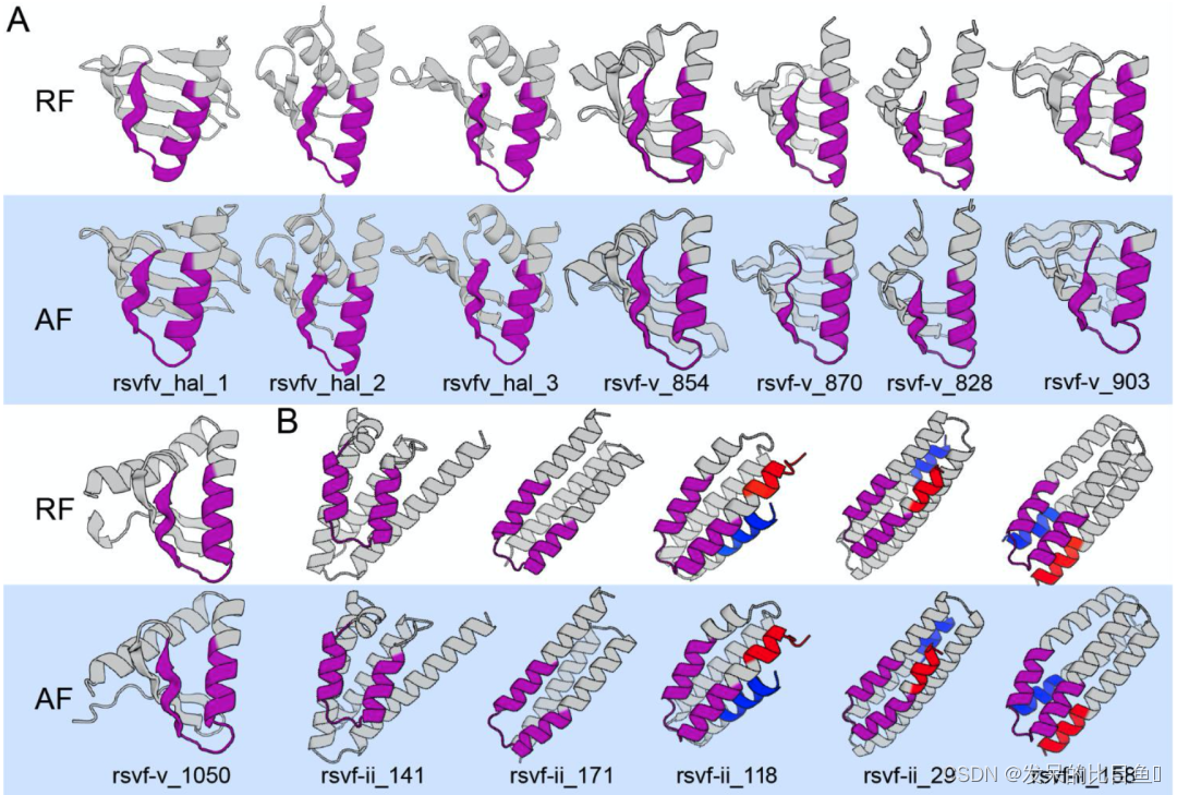 (A) RSV-F 位点 V 和 (B) 位点 II 表位支架的 RosettaFold (RF) 和 AlphaFold (AF) 模型:功能性基序以紫色突出显示,一些设计中的N端和C端被涂色为蓝色和红色,以强调幻觉可以找到不同的拓扑解决方案,尽管具有相似的整体折叠。