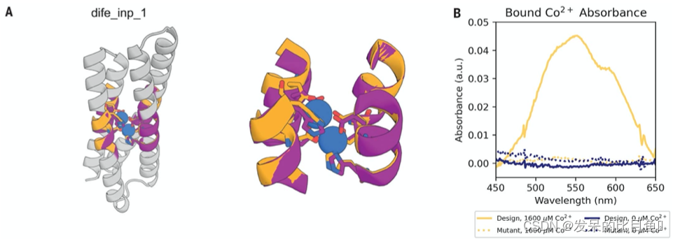 作者选择了 96 个恢复设计(Inpained)进行实验测试,发现 76 个具有可溶性表达,至少 8 个具有indicative Co2+ 结合(铁结合的代表)和三个(dife_inp_1, dife_inp_2 和 dife_inp_3具有与设计折叠一致的 CD 光谱,并通过金属结合稳定。金属结合残基的突变消除了结合,dife_inp_1 的滴定分析表明,两个金属结合位点都成功搭建了支架。