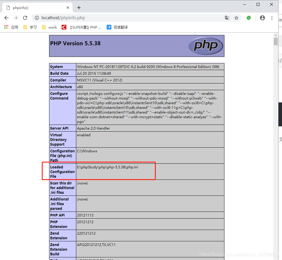 保存,并且访问它,得到如下,标记红色框框的为当前php配置文件php.ini的路径