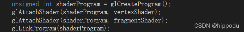 最终的着色器程序对象是多个着色器合并之后最终链接完成的版本,前面完成创建的顶点着色器和片段着色器需要被Link为一个着色器程序对象,然后在渲染对象时激活这个着色器程序,以及后续调用激活的着色器程序。