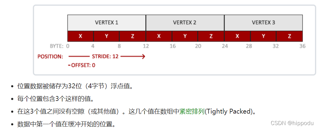顶点数据:顶点数据用来为后面的顶点着色器等阶段提供处理的数据。是渲染管线的数据主要来源。送入到渲染管线的数据包括顶点坐标、纹理坐标、顶点法线和顶点颜色等顶点属性。为了让OpenGL明白顶点数据构成的是什么图元,我们需要在绘制指令中传递相对应的图元信息。常见的图元包括:点(GL_POINTS)、线(GL_LINES)、线条(GL_LINE_STRIP)、三角面(GL_TRIANGLES)。